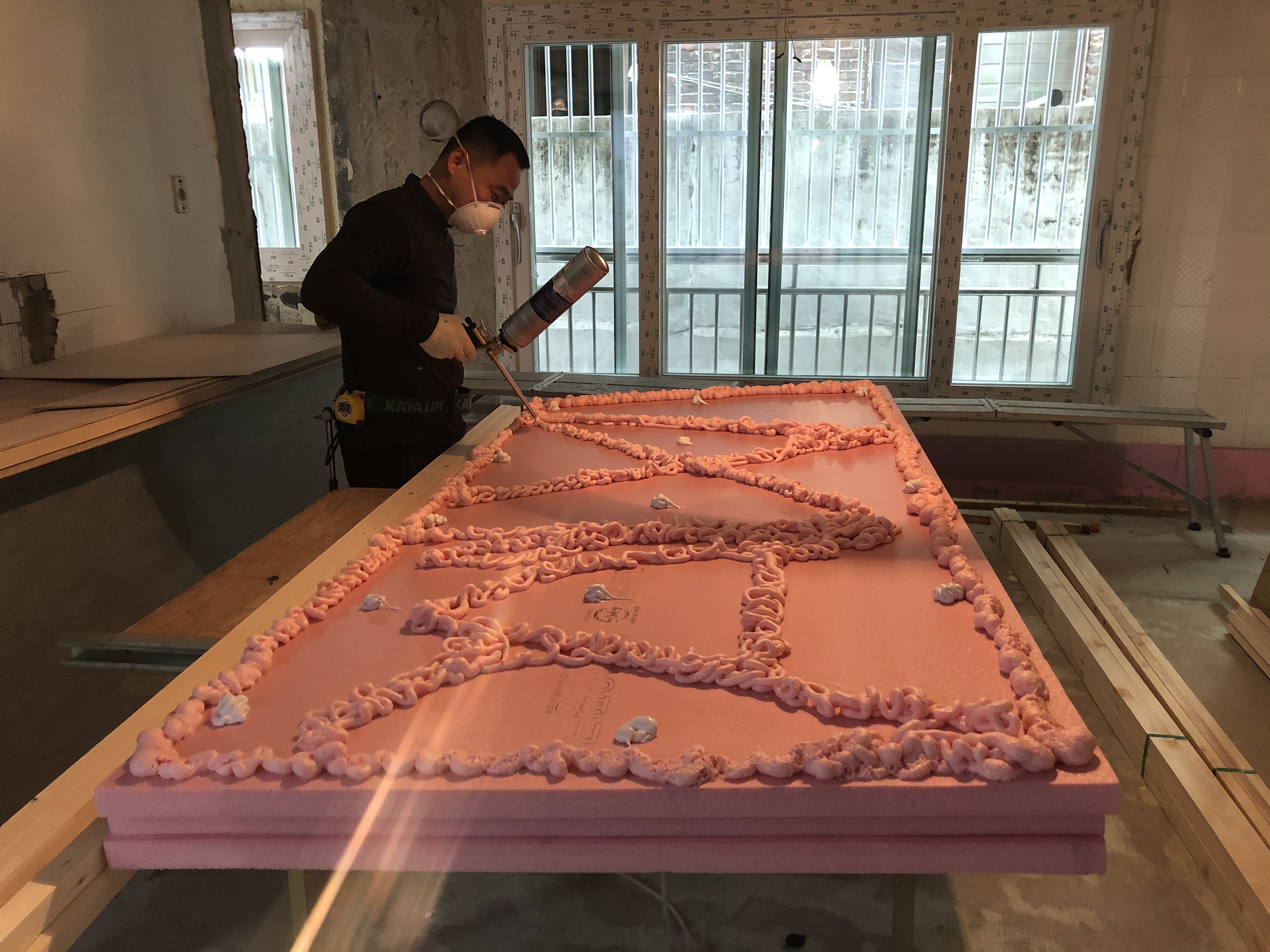 압출법보온판(XPS)으로 분류되고 콘크리트에는 접착률이 떨어져서 우레탄폼이나 우레탄본드 등으로 벽에 부착한다.