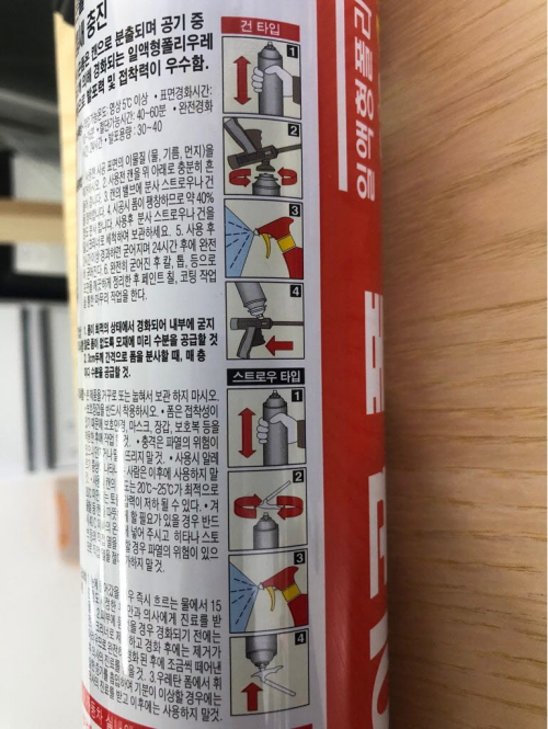 폼 사용은 건 모양대로 사용하면 된다. 천정에 사용할 경우 가스만 나올 수 있으니 충분히 흔든다음 재빨리 사용해야한다(캔이 누우면 마찬가지로 잘 안나온다)