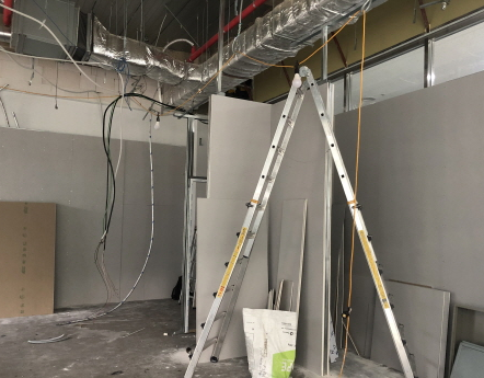 보통 상가 천정에 텍스로 되어있는데 이 텍스를 경량철골에서 시공한다. 천장볼트 와 연결해서 스터드를 고정하고 천정텍스를 고정한다. 작업자 들은 비계 같은 걸 길게 연결해서 서서 작업을 쉽게 하기 위해 만들어 사용합니다.